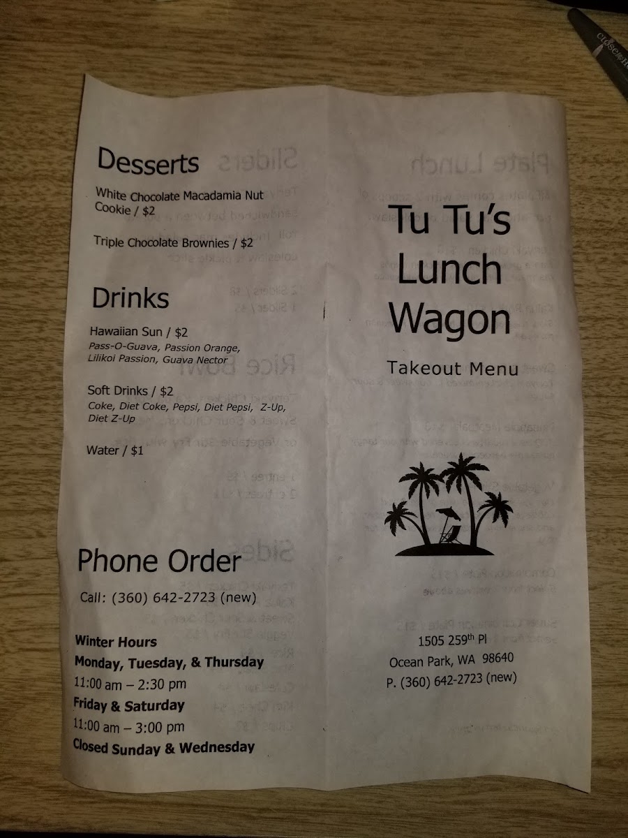Welcome to Tu Tu's Lunch Wagon, located in the beautiful Ocean Park, WA. This charming food truck offers a taste of Hawaii right at your fingertips. Their daily lunch menu showcases hearty plate lunches featuring delightful options like Teriyaki Chicken, Kalua Pork, and Pineapple Meatballs, served with two scoops of rice and a choice of macaroni salad or coleslaw for just $10.00. The rice bowls, priced at $9.00, allow you to savor the same delectable proteins over a bed of rice.